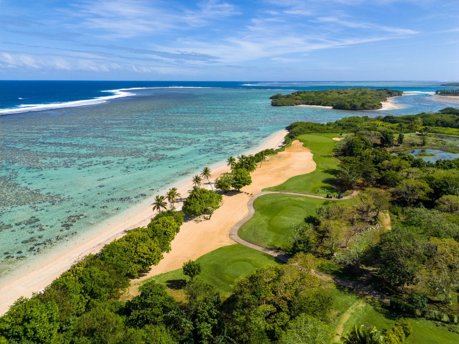 The front nine is where the course truly shows off the “Fiji Blue” beach scenes. It’s coastal, somewhat exposed, and wildly beautiful, with rolling fairways shaped by the bay’s natural contours. Several holes run adjacent to the water’s edge and depending on what time of day you play (I suggest an early morning tee time), the wind becomes a genuine part of the strategy. The par‑3 4th is the signature showstopper with a dramatic carry over an aquamarine cove that delivers one of the most memorable tee shots in the South Pacific.